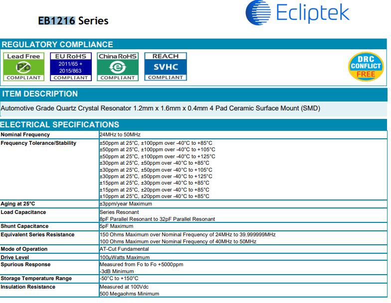 EB3250YA12-16.000M TR | Ecliptek晶振 | CRYSTAL 16.0000MHZ 12PF SMD | -40°C ~ 125°C |