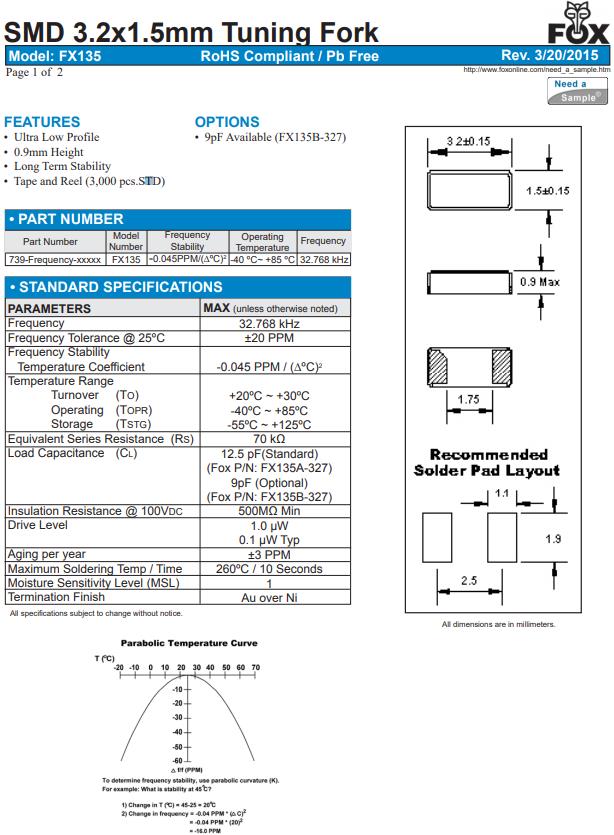 FX135A-327 | FOX晶振 | FX135A | kHz Crystal (Tuning Fork) | 32.768kHz | - |