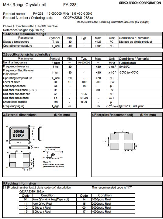 愛(ài)普生公司非常高興推出了FA-238晶振,石英晶體諧振器編碼Q22FA2380128616,頻率16.000000兆赫,尺寸(LxWxH)3.2 x 2.5 x 0.7 mm,客戶(hù)負(fù)載電容18pf,頻率公差+ / -30 ppm,F(xiàn)o / temp。特征公差+ / -30 ppm,溫度范圍-20至+70°C,具有超高的穩(wěn)定性能,低電壓,低相位的特點(diǎn),常常用于電子門(mén)控制器,藍(lán)牙燈控模塊,蘋(píng)果手機(jī)藍(lán)牙音響,通信設(shè)備等行業(yè)。