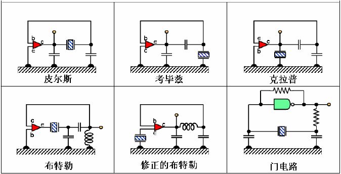 在許多振蕩器電路中,有三種常用的振蕩器電路,它們是皮爾斯振蕩電路,考畢茲振蕩電路和克拉普振蕩電路。這些振蕩電路除了頻射接地點位置不同外,電路的構成都是相同的。布特勒和修正的布特勒振蕩電路也是彼此相似的,每一種電路中的發射極電流就是晶體的電流。門電路振蕩器是皮爾斯型的,它使用了一個邏輯門并在皮爾斯振蕩器的晶體管位置加了一個電阻。(某些門電路振蕩器使用一個以上的門電路。)