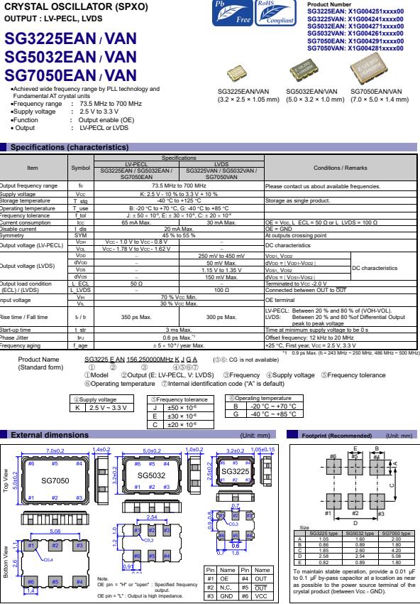 X1G004261000100 SG5032VAN 100.000000 MHz 5.00 x 3.20 x 1.20 mm LVDS 2.250 to 3.630 V -40 to 85 °C +/-50 ppm