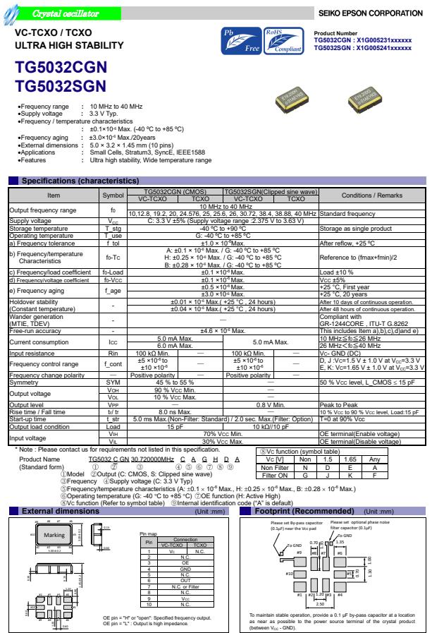 X1G005231004900 | TG5032CGN | 25.000000 MHz | 5.00 x 3.20 x 1.45 mm | CMOS | 3.135 to 3.465 V | +/-1.0 ppm | -40 to ++85 °C |