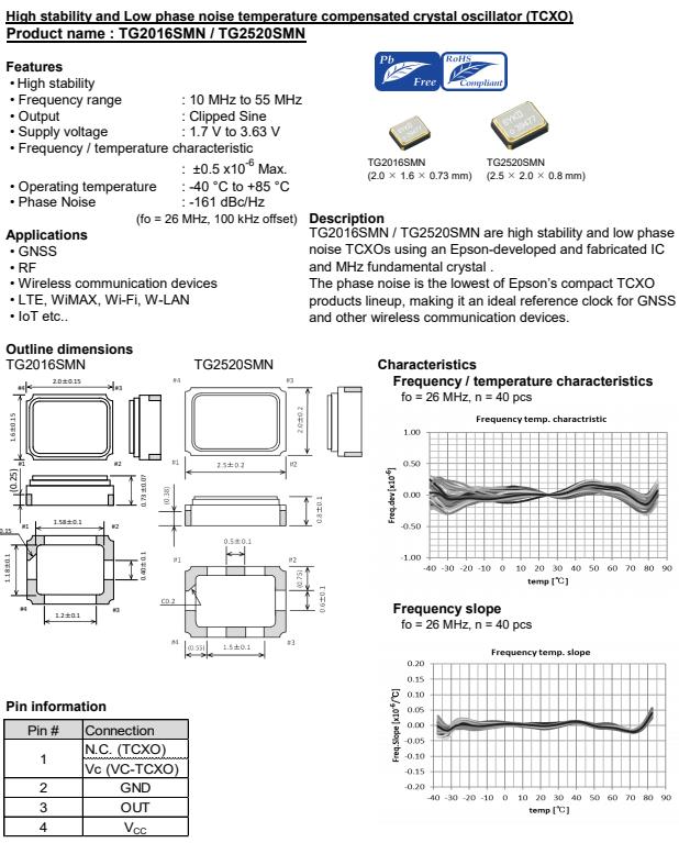 X1G005421030427 | TG2520SMN | 26.000000 MHz | 2.50 x 2.00 x 0.80 mm | 2.660 to 3.465 V | +/-1.5 ppm | -40 to +85 °C | +/-0.50 ppm |