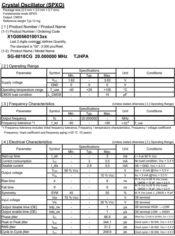 X1G005601001400 | SG-8018CG | 20.000000 MHz | 2.50 x 2.00 x 0.80 mm | CMOS | 1.620 to 3.630 V | -40 to 105 °C | +/-50 ppm | ≤ 3.5 mA |