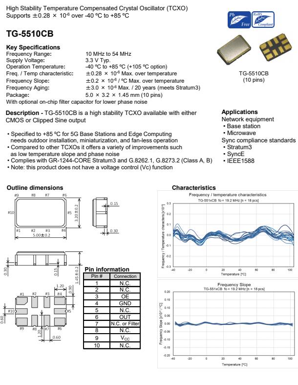 愛普生公司推出了TG-5510CB晶振,溫補晶振編碼X1G006061009514,頻率20.000000兆赫,輸出WaveCMOS,電源電壓3.13 ~ 3.46 V,電源電壓(一般)3.300 V,尺寸(LxWxH)5.0 x 3.2 x 1.5 mm,操作溫度-40至+85°C,頻率公差+/- 1.0 ppm,說明- TG-5510CB是一種高穩定性TCXO可與任何一種CMOS或裁剪正弦輸出,5G基站和邊緣計算可調至+85℃,需要戶外安裝,小型化和無風扇操作,與其他tcxo相比,它提供了各種改進,如由于低溫的坡度和相位噪聲,符合GR-1244-CORE Stratum3和G.8262.1, G.8273.2 (A類,B類),注意:本產品沒有電壓控制(Vc)功能,應用程序:網絡設備,5G室外基站控制器,微波,同步遵從性標準,Stratum3,SyncE,IEEE1588,具備良好的耐壓性能以及可靠性能。