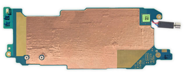 緊接著來看一下主板正面芯片布局詳解,現在看到的是主板背面,啥也沒有,只貼著一層銅箔.總的來說,HTC對于驍龍810的處理很簡單,沒有加強散熱手段,也沒有更高級的電源管理,難怪要比nubia Z9 Max熱得多!主板去掉了,才能取下電池.HTC還真是固執啊.
