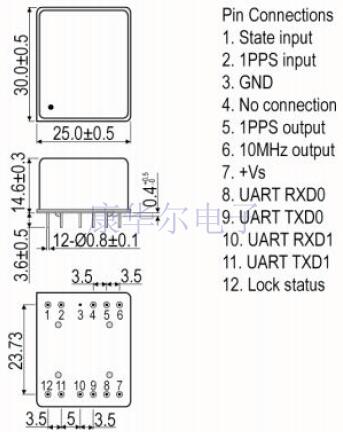 狀態輸入(引腳1):時鐘模塊將其本地時鐘與參考輸入(例如來自GPS的1PPS)同步.當狀態輸入引腳被驅動為高電平時,它將執行正常的同步算法.當狀態輸入引腳被驅動為低電平時,恒溫晶振也可以被迫在自由運行或保持狀態下工作.注意:必須將pin1(狀態輸入)設置為“高”或“低”,并且不要斷開連接.