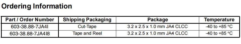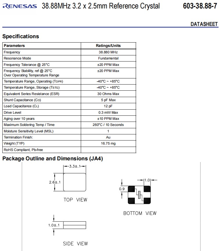603-38.88-7JA4I | Renesas晶振 | CRYSTAL 38.8800MHZ 12PF SMD |
