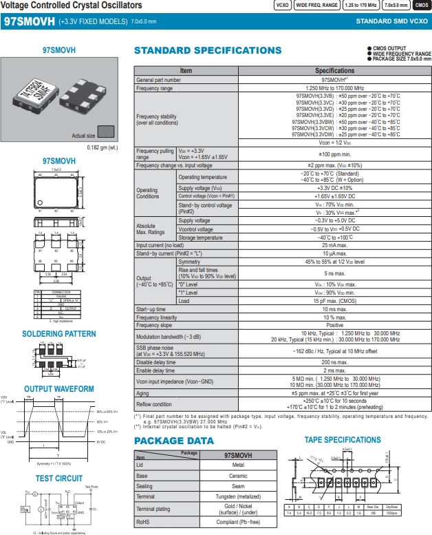 SMI晶振,有源晶振,97SMOVH壓控振蕩器.有源石英晶振,外觀完全使用金屬材料封裝的,產品本身采用全自動石英晶體檢測儀,以及跌落,漏氣等苛刻實驗.產品本身具有高穩定性,高可靠性的石英晶體諧振器,焊接方面支持表面貼裝,外觀采用金屬封裝,具有充分的密封性能.