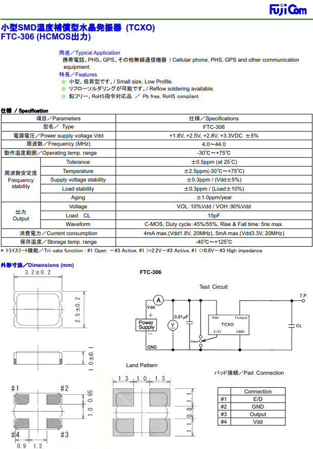 富士晶體,fujicom晶振,FTC-306溫補(bǔ)振蕩器.小型,輕型,低消耗電流,表面貼片型產(chǎn)品.(可對(duì)應(yīng)回流焊)無鉛產(chǎn)品.富士晶振滿足無鉛焊盤的高溫回流溫度曲線要求,帶有AFC(頻率控制)功能,Enable/Disable功能,產(chǎn)品本身可根據(jù)使用需要進(jìn)行選擇.