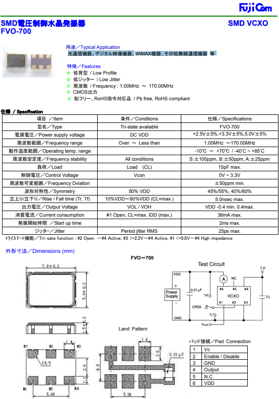 富士晶體,VCXO振蕩器,FVO-700石英振蕩子.貼片式石英晶體振蕩器,低電壓啟動功率,并且有多種電壓供選擇,比如有1.8V,2.5V,3.3V,3.8V,5V等,富士晶振被廣泛應(yīng)用于,平板筆記本,衛(wèi)星系統(tǒng),光纖通道,千兆以太網(wǎng),串行ATA,串行連接SCSI,PCI-EXPress的SDH / SONET發(fā)射基站等領(lǐng)域.符合RoHS/無鉛