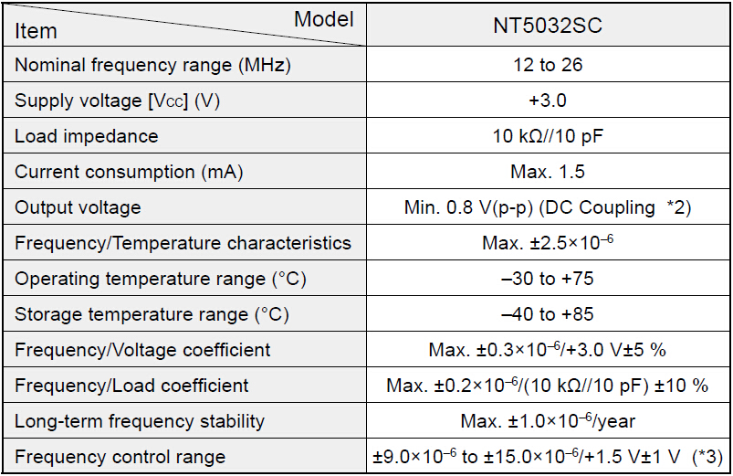 溫度補償晶振,NT5032SC有源晶振,NDK株式會社,為對應低電源電壓的產品,(可對應DC+2.4 V±0.1 V to +3.3 V±5 %),高度:最高1.5 mm、體積:0.022cm3、重量:0.06g,超小型、量輕,帶有AFC(頻率控制)功能,低消耗電流,表面貼片型產品,(可對應回流焊)無鉛產品,滿足無鉛焊接的回流溫度曲線要求.