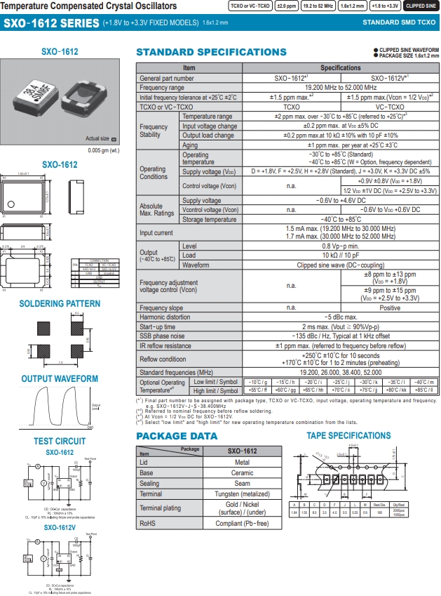SMI晶振,壓控溫補晶振,SXO-1612V晶振.小型表面貼片型貼片晶振,較適合使用在汽車電子領域中,也是特別要求高可靠性的引擎控制用CPU的時鐘部分.低頻晶振可從19.2MHz起對應,小型,薄型具備強防焊裂性,石英晶振在惡劣嚴酷的環境條件下也能發揮穩定的起振特性.