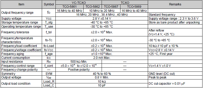 愛普生有源晶振,TCO-5861,5862,5867,5869振蕩器,智能多媒體晶振,頻率范圍10MHz~40MHz,電源電壓2.8V,絕對(duì)頻率控制范圍2×10-6,功能使能(OE),外部尺寸規(guī)格3.2×2.5×0.9mm,編帶包裝方式,有源石英晶振,無論是溫補(bǔ)晶體也好,壓控晶振也罷,產(chǎn)品均采用了,離子刻蝕調(diào)頻技術(shù),比目前一般使用的真空蒸鍍方式調(diào)頻.