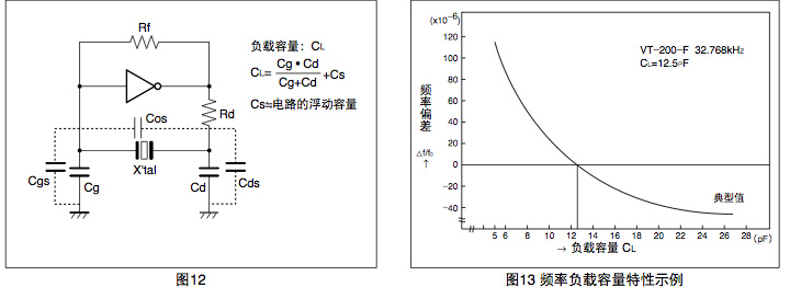 負載容量 (CL) 是用來決定在振蕩電路中晶振頻率的參數,從加在振蕩電路中晶振兩端的電容可知負載容量(參閱圖12). 因振蕩電路的負載容量的不同,晶振的頻率會相應地產生變動.為了獲得目標的頻率精度,必須使晶振與負載容量相匹 配.在使用時,請根據相應晶振的負載容量,將振蕩電路的負載容量設定為與其相符.