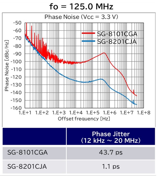 與現有的SPXO SG-8101CGA相比,在100 kHz至1 MHz的偏移頻率下,相位噪聲改善了約30 dBc/Hz,相位抖動降低至約1/40。SG-8201CJA通過降低噪聲水平來降低抖動。它有助于提高傳感器的探測范圍和分辨率。