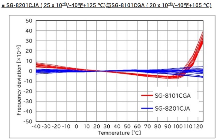 與現有的SPXO SG-8101CGA相比,該產品可以調節高達+125 ℃的溫度變化,并在很寬的溫度范圍內具有高穩定性。SG-8201CJA即使在各種汽車應用要求的惡劣溫度條件(-40 ℃至+125 ℃)下也能實現穩定的頻率容差。