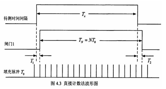 高精度的時(shí)間測(cè)量是實(shí)現(xiàn)馴服保持的基礎(chǔ),一般都使用比時(shí)法測(cè)頻差的方法實(shí)現(xiàn)對(duì)恒溫晶振的鎖定,其中最常用的方法就是直接計(jì)數(shù)法,即在有待測(cè)時(shí)間間隔構(gòu)成的閘門信號(hào)中填入脈沖,通過必要的計(jì)數(shù)電路,得到填充脈沖的個(gè)數(shù)后再乘以填充周期便可計(jì)算出待測(cè)的時(shí)間間隔。但是這種方法的測(cè)量精度很低,主要取決于填充脈沖的頻率,有源晶振頻率越高測(cè)量精度越高,但在實(shí)際應(yīng)用中,這會(huì)大大提高對(duì)相應(yīng)器件和線路的要求,同時(shí)還存在±1個(gè)字的量化誤差,直接計(jì)數(shù)法如圖4.3