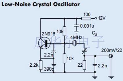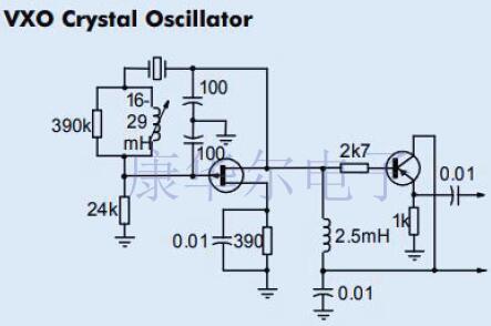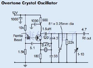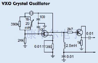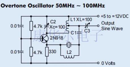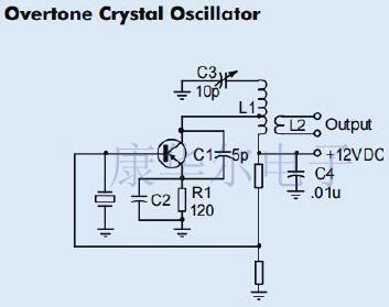 該電路中的晶體直接連接在晶體管的基極和地之間.由于晶體管的內(nèi)部電容,電容器C1用于改善反饋.該電容器應(yīng)盡可能靠近晶體管安裝.晶體管集電極中的LC儲能電路被調(diào)諧到晶體的泛音頻率.發(fā)射極電阻電容器在工作頻率下必須具有大約90Ω的容抗.電感器L1上的抽頭用于匹配晶體管集電極的阻抗.通常,此抽頭的位置距離線圈冷端約三分之一.陷阱的放置是在穩(wěn)定性和最大功率輸出之間的權(quán)衡.輸出信號取自鏈接耦合線圈L2,并通過變壓器作用進(jìn)行工作.