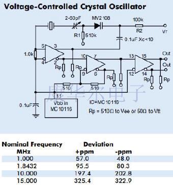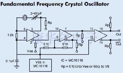 對于低于20MHz的頻率,可以使用基頻晶體,并且不再需要諧振槽.同樣在這個(gè)較低的頻率范圍內(nèi),典型的MECL10,0002ns的傳播延遲與振蕩周期相比也變小,因此必須使用同相輸出.因此,MC10116振蕩器部分僅用作放大器.1.0kΩ電阻將線路接收器偏置在Vss附近,而0.1µF電容器是Vbb電源的濾波電容器.與晶體串聯(lián)的電容器可提供較小的頻率調(diào)整.MC10116的第二部分作為施密特觸發(fā)器電路連接,可確保從低于20MHz的慢速輸入信號獲得良好的MECL沿.MC10116的第三級用作緩沖器,并提供晶體振蕩器電路的互補(bǔ)輸出.該電路的最大工作頻率約為20MHz,最小約為1MHz.使用基本模式晶體.