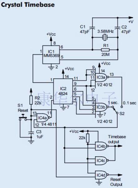 板載振蕩器和17級分頻器組成IC1.如圖所示,通過連接標(biāo)準(zhǔn)的3.58MHz電視色同步晶體,可在IC輸出的引腳1上產(chǎn)生60Hz方波的精確信號源.然后將這些脈沖饋入4024七級波紋計(jì)數(shù)器IC2.它的輸出直接連接到IC3中的不同門,IC3是雙四輸入NAND門.根據(jù)脈沖選擇開關(guān)S2占據(jù)哪個(gè)位置,這些門之一將提供選定寬度的輸出/復(fù)位脈沖. 使用不同的電路設(shè)計(jì)制造出來的振蕩器性能,功能,應(yīng)用,封裝尺寸都不一樣,現(xiàn)在也有越來越多的新型電路出現(xiàn),康華爾電子后續(xù)會(huì)再為大家總結(jié)一些相關(guān)的信息.還想了解哪方面的晶振知識,可以到http://m.huaxiaqing.com/官網(wǎng)上留言,我們竭誠為廣大新老客戶服務(wù).